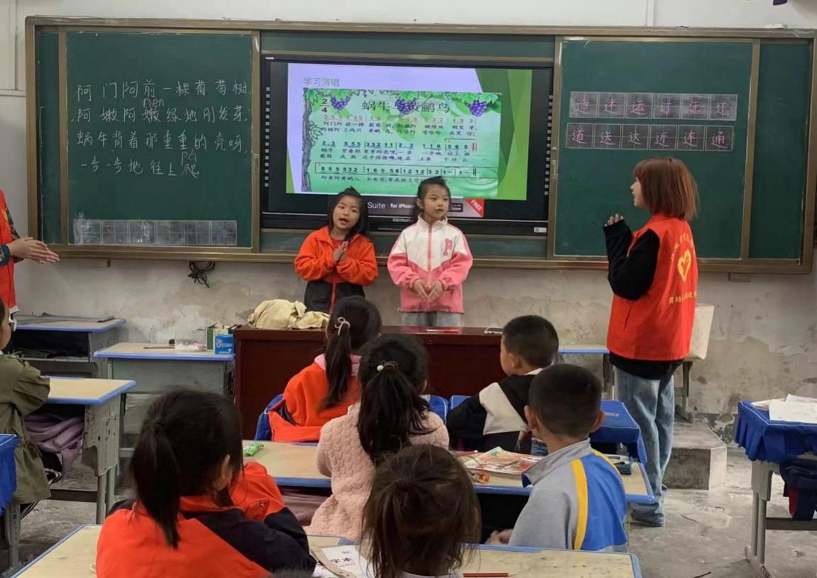 志愿者们在按照分配好的班级进行授课、讲解,根据自己安排的备课方案上课,二年级复习了上节课学习的《春晓》并学习了新曲目《虫儿飞》,五年级学习了钢琴与音阶的认识,六年级学习了《送别》。相比第一次的支教活动,能感觉到这些孩子们从一开始的怯生生到现在的主动跟唱,积极踊跃的发言,每一张脸上都洋溢着笑容。