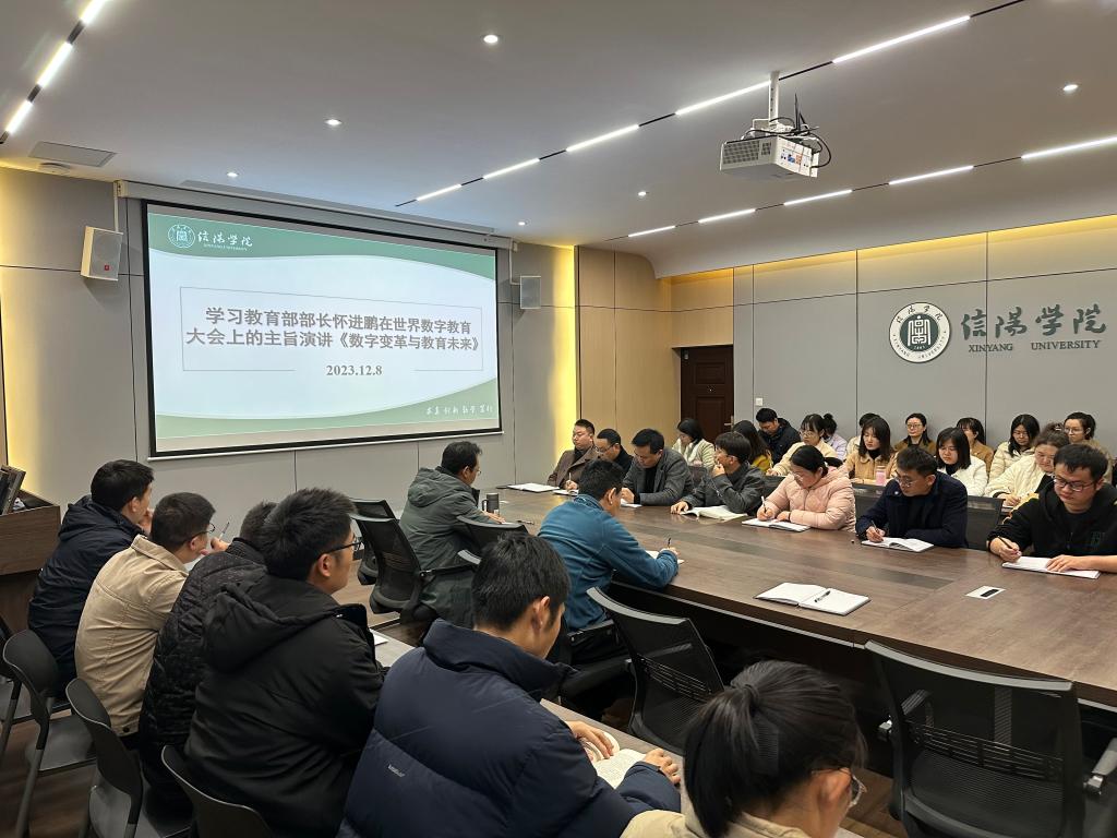 杨子泉带领全体教师学习教育部长怀进鹏在世界数字教育大会上的主旨演讲:数字变革与教育未来,一是智慧教育助力基础教育,让优质均衡的理想照进现实。二是智慧教育助力高等教育,让大学一流课程突破校园边界。三是智慧教育助力职业教育,让更多人获得职业发展能力。四是智慧教育助力就业创业,让人才供给和市场需求更加有效对接。他最后鼓励青年教师提升数字化素养,利用数字技术,加快构建适应社会发展的教学创新新模式,积极探索多样态学习,充分运用慕课、微课、虚拟现实等多种方式,提供智能化的学习环境、充满活力的线上教育大课堂。以此次数字变革与教育未来为契机,认真教书育人,推进教育教学改革,提升教育教学能力,为培养高素质应用型人才奠定基石。