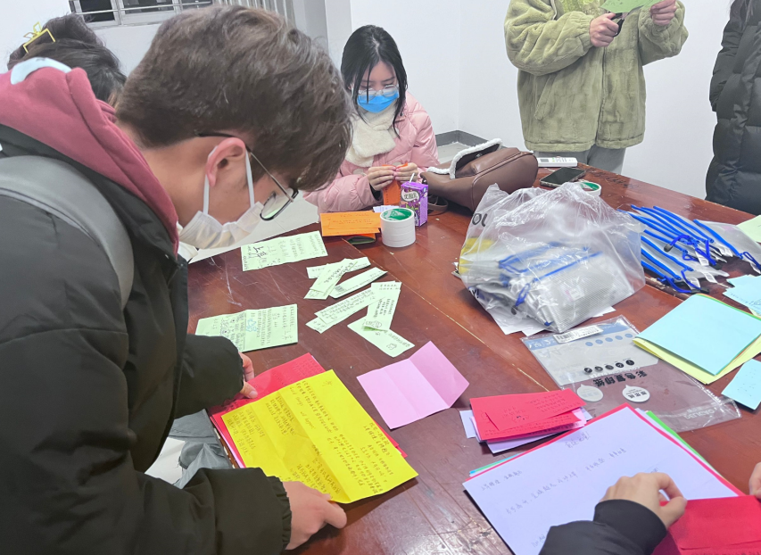 周连峰传达讲解了2024年考研政策调整及注意事项,学院领导还为备战考研的学子送上暖心礼包,同时带来了学弟学妹们写给考研学子的温暖祝福。