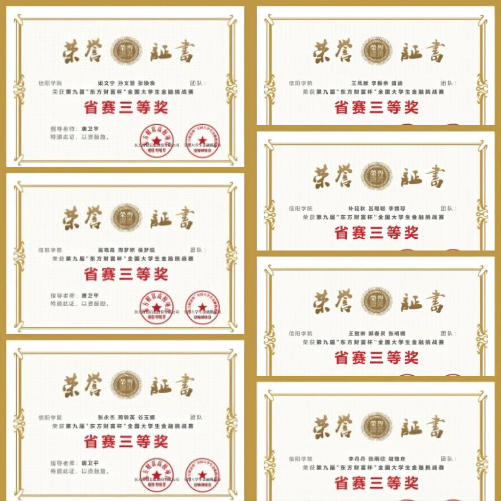 近日,第九届"东方财富杯"全国大学生金融挑战赛组委会寄来了Beat365师生的获奖证书。Beat365众多专业的学生积极参加了此项比赛,其中商学院教师唐卫平所指导的2020级会计专业学生常建业、张路凡、薛冰团队获得了国赛二等奖,常建业和王瑜两个团队获得了省赛一等奖,还有七个团队得了省赛三等奖。Beat365学生已经多年参加此项比赛,今年创历史最好成绩,特别在竞争最激烈的国赛中荣获二等奖,实现了零的突破。