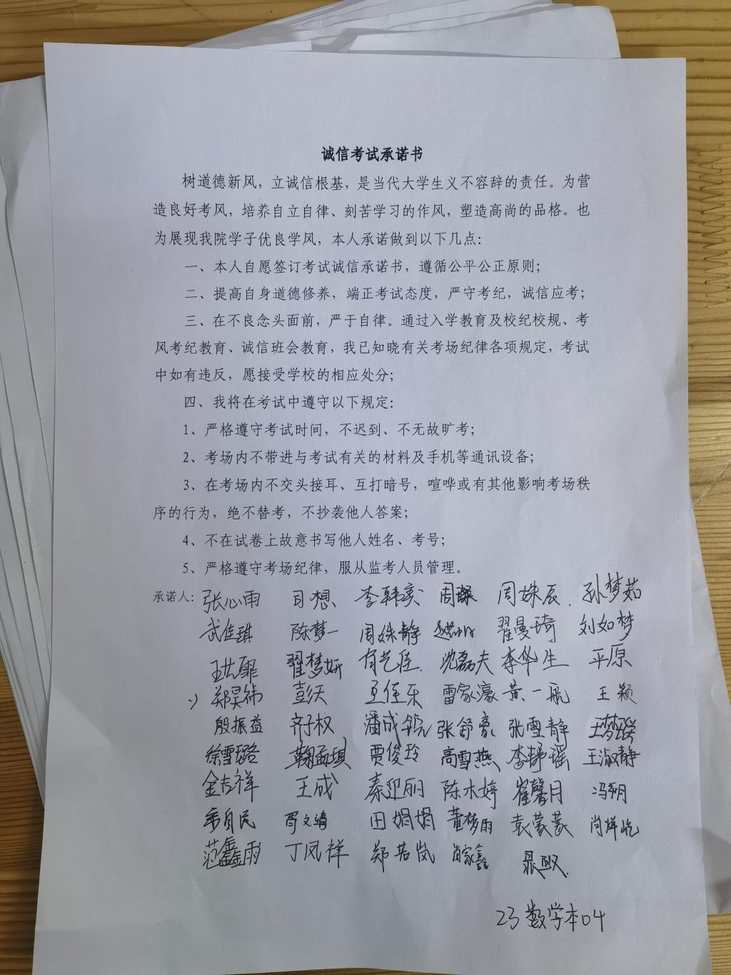 各班学习委员组织学生签署了诚信考试承诺书,全体同学郑重做出遵守考试纪律、诚信参加考试的承诺。