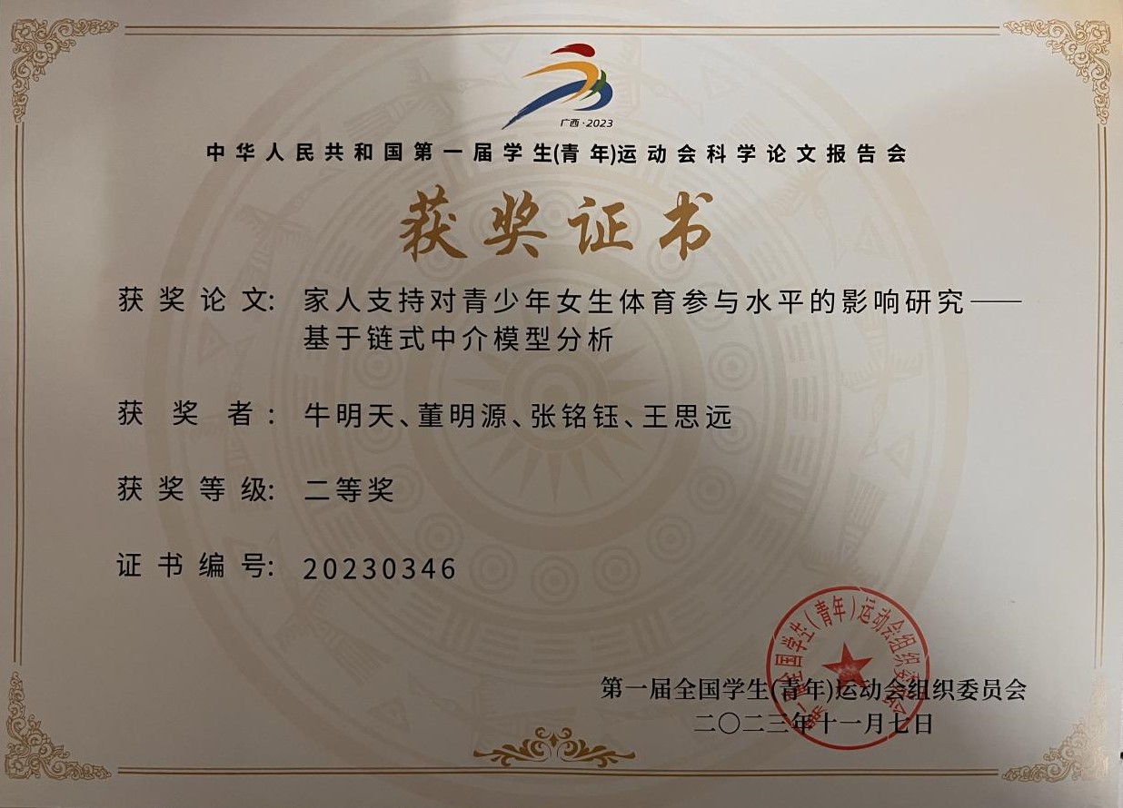 “服务强国建设,推进新时代青少年和学校体育高质量发展”为主题的全国第一届学生(青年)运动会科学论文报告会是国内综合性体育学术会议,是全国体育科技工作者展示最新体育科研成果、交流科技信息的盛会。近日,全国第一届学生(青年)运动会科学论文报告会组委会公布了第十三届全国体育科学大会论文录取结果。本次科报会共收到论文2423篇,评选出获奖论文928篇,Beat365公共体育教学部李利华和牛明天老师分别获得二等奖。