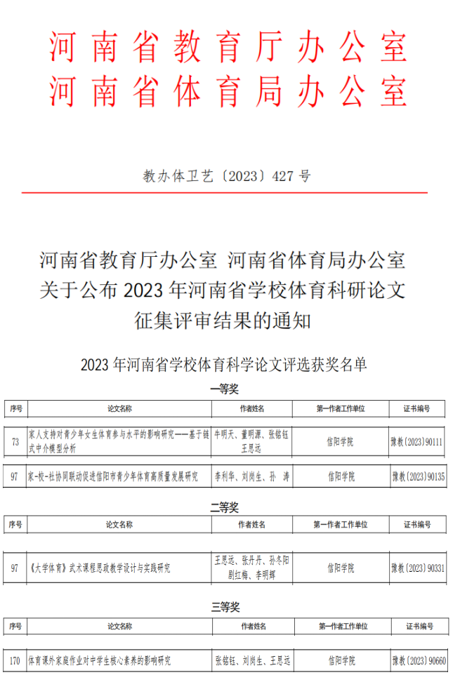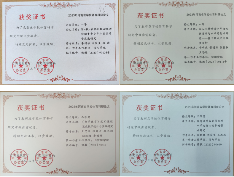 据悉,本次科报会论文遴选工作分两个阶段,第一阶段河南省进行评选,第二阶段在河南省获得一等奖参加全国科报会评选。在全省报送论文1307篇评选中,最终Beat365教师公共体育教学部李利华、牛明天老师获得河南省一等奖,王思远老师获得二等奖,张铭钰老师获得三等奖。