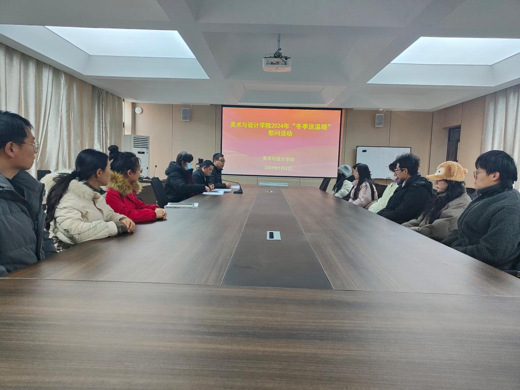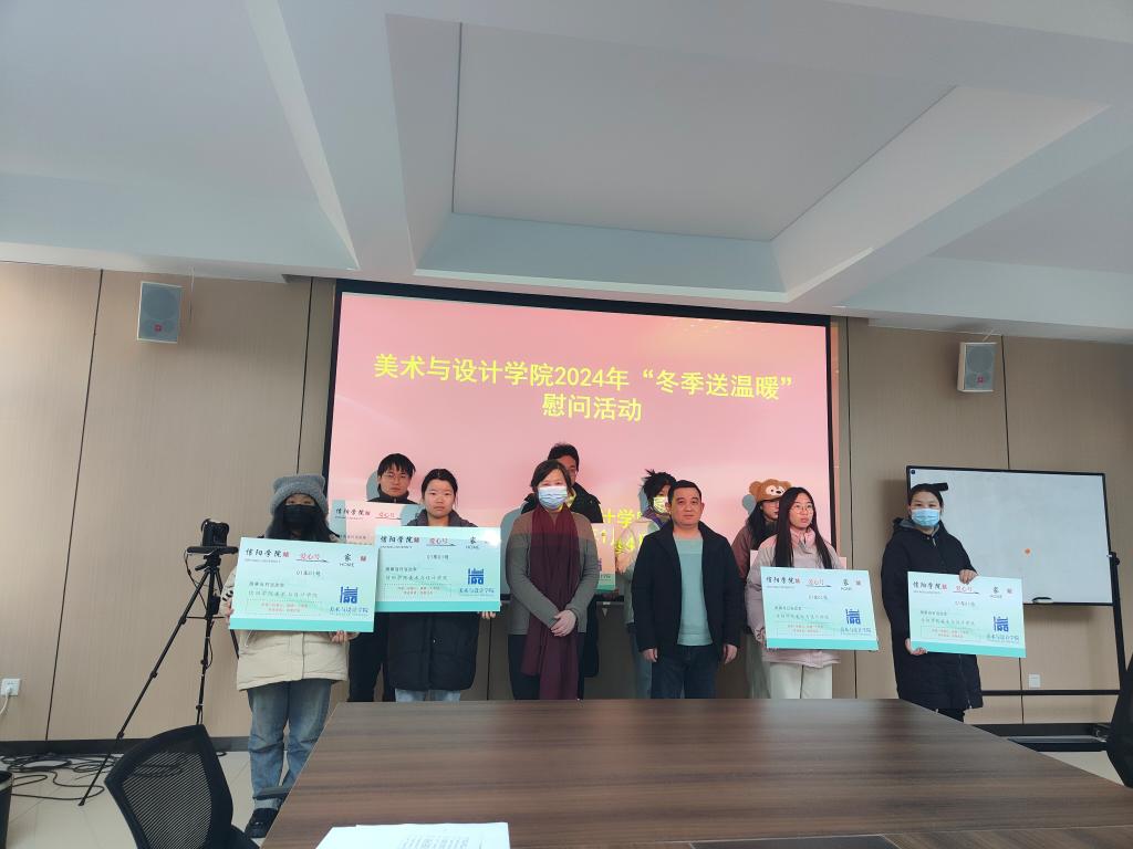日复一日,年复一年,冬日再次悄然而至,美术与设计学院对学生的关爱一如既往,且历久弥坚。为帮助家庭经济困难学生度过一个温暖愉悦的寒冬,让他们能安心学习,快乐生活,共同营造友爱和谐的校园氛围,2024年1月4日下午美术与设计学院开展“冬季送温暖”慰问活动,学院院长张瑞瑞,党总支书记袁军,学工干事秦金峰,部分辅导员老师和困难学生代表参加本次慰问活动。