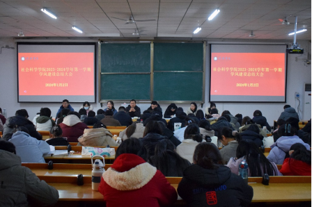 为进一步凝聚团学工作力量、总结工作经验、梳理工作思路、表彰优秀先进,2024年1月4日下午,社会科学学院在社科楼219教室召开2023-2024学年团学表彰、学风建设总结暨诚信考试动员大会。党总支副书记胡志国、学工负责人陈苗苗、团总支书记韩铁映、全体辅导员以及学生代表参加本次活动。本次活动由陈苗苗主持。