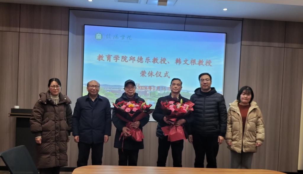 会议进行第二项,我院举行邱德乐教授和韩文根教授荣休仪式。两位教授分别发表临别感言,千言万语汇聚成感谢和期盼,感谢能够在教育学院这个大家庭愉快工作,期盼教育学院的未来越来越好,青年教师得到更好的发展,祝福每一位老师身体健康。