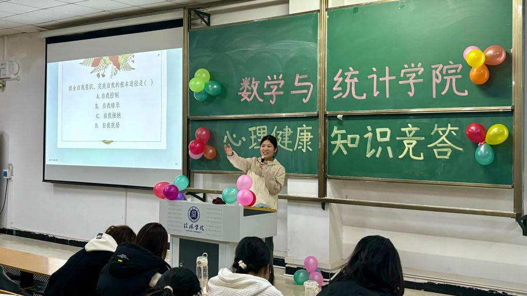 10月20日晚,数学与统计学院“探索心灵奥秘,拥抱幸福生活”心理健康知识竞答活动在社科楼219教室隆重举行,近200名学生参与了此次活动。在主持人张舒畅的带领下,同学们了解了心理健康的重要性,学习了丰富的心理健康知识,通过“数字炸弹”“看图猜成语”等一系列的小游戏,调动了同学们的积极性和主动性,更加重视自身的心理健康水平。