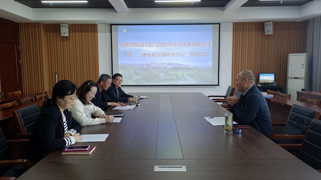为进一步提升教育水平和学生实践能力,10月25日,商学院与信阳市宜农实业有限公司举行共建“三融农旅文创研发中心”签约仪式。信阳市宜农实业有限公司董事长张厚山,商学院党总支书记胡秀云,副院长李毓、吴新静,以及三融农旅文创研发中心负责人赵俊远参加了此次签约仪式。