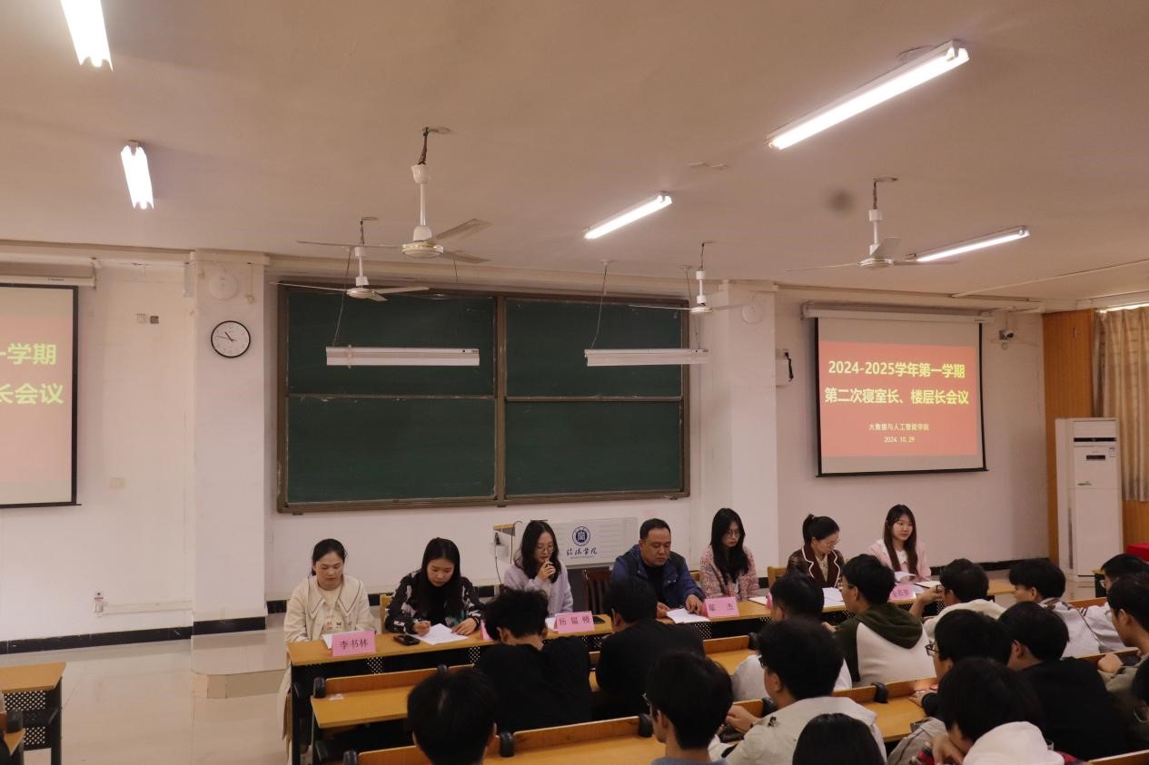 为进一步落实学生公寓安全网格化管理办法,充分发挥楼层长与寝室长自我管理、自我教育、自我服务的作用,10月29日中午,大数据与人工智能学院在人文楼108教室召开本学期第二次楼层长、寝室长大会。学院学工干事鄢杰、全体辅导员和楼层长、2024级寝室长参加会议。会议由学院宿管工作负责人杨韫幔老师主持。