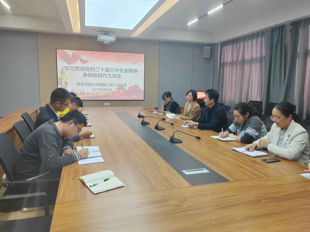 党的二十届三中全会是在以中国式现代化全面推进强国建设、民族复兴伟业的关键时期举行的一次重要会议。10月30日下午,数学与统计学院教工第一党支部和第二党支部分别组织召开“学习贯彻党的二十届三中全会精神,争做新时代大先生”主题学习会。