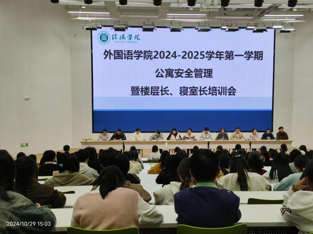 为进一步加强公寓安全管理,提升楼层长、寝室长的安全意识和管理能力,营造卫生舒适、奋进和谐的寝室环境。2024年10月29日,外国语学院在教二楼117成功举办了2024-2025学年第一学期公寓安全管理工作会暨楼层长、寝室长培训会议。出席本次会议的有学工干事何珊珊、团总支书记郑青、全体辅导员及各年级班长、生活委员、楼层长、寝室长。