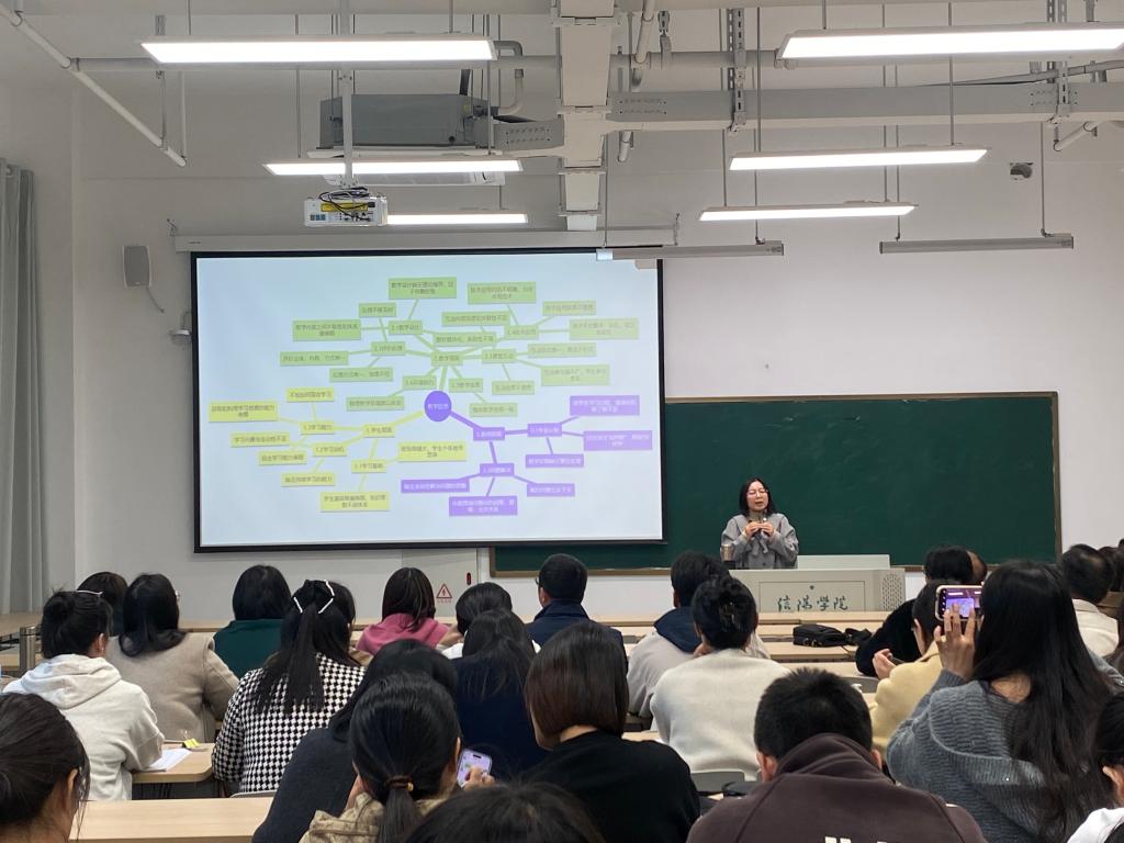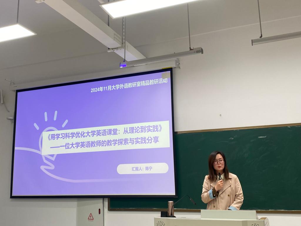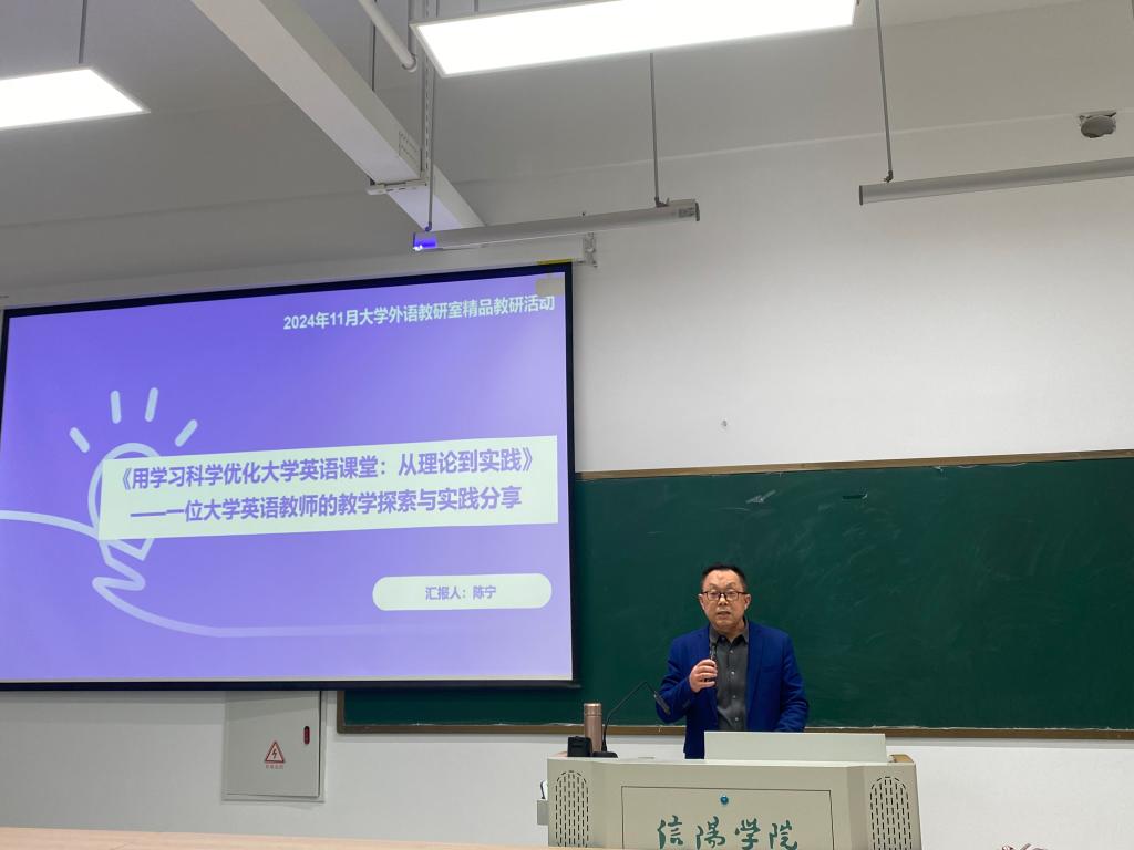 为进一步推动大学英语课程教学改革,推动大学英语课堂的优化与创新,外国语学院大学英语教研室于11月5日下午在南湖校区教二楼213教室成功举办了主题为《用学习科学优化大学英语课堂——从理论到实践》的教研活动。外国语学院院长罗德喜教授、督导专家段云虹教授、郭耀忠教授以及外国语学院全体教师参加了本次活动。本次活动由荣获第五届河南省本科高校教师课堂教学创新大赛外语教学赛道大学英语综合小组决赛一等奖获得者陈宁老师主讲,大学英语教研室主任陈彦慧老师主持。