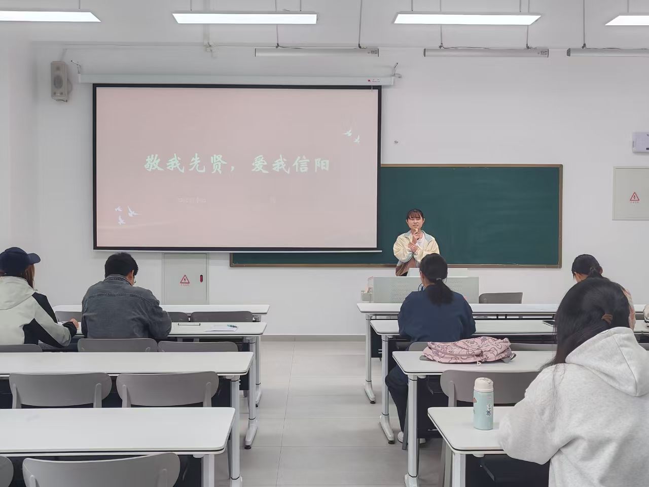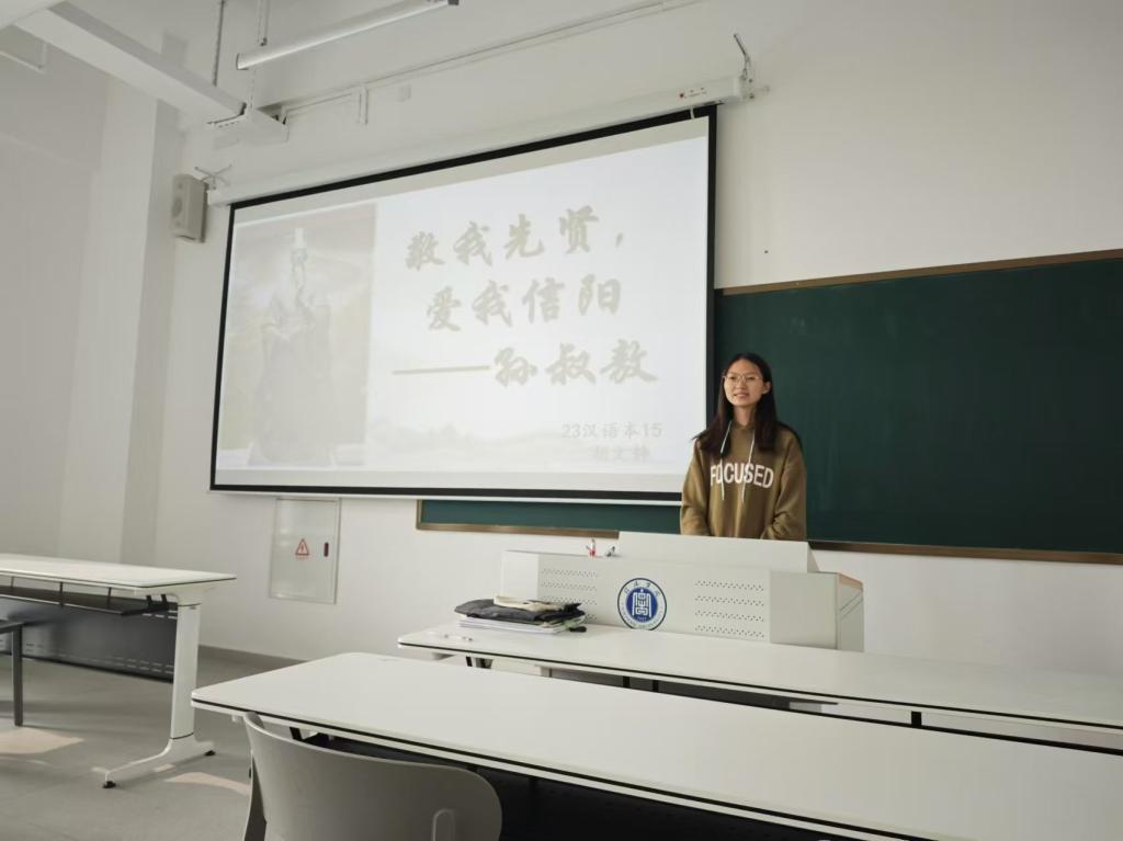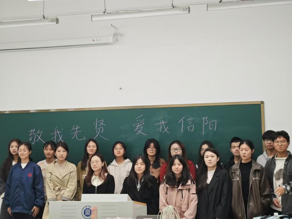 李增亚娓娓道来,从信阳地理位置入手,向我们介绍了淮河第一城信阳,紧接着向我们介绍息夫人、吴焕先、邓颖超等历史名人,并为我们讲解了信阳历史文化,从新石器时期至近现代,罗山的皮影、信阳的毛尖、鸡公山等等,让同学们更加深刻地感受到信阳这座古城的历史韵味。王芳芳为我们讲述革命烈士吴焕先的英勇事迹,描绘了革命道路上战士们舍己为国、英勇战斗的壮丽篇章,宣传了红色革命文化,更加激起我们对革命先烈的敬佩。