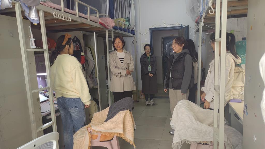 在走访过程中,高昌慧亲切地与学生们交谈,详细询问了他们的学习生活情况、困难和需求,鼓励同学们积极参与校园活动,丰富课余生活。田媛提醒同学们注意财产安全、人身安全和用电安全,谨防各类电信诈骗。