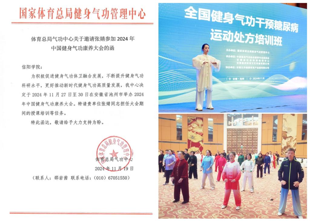 11月25日—30日,由国家体育总局健身气功管理中心、中国健身气功协会、安徽省体育局及安徽省池州市人民政府共同主办的首届中国健身气功康养大会在安徽省池州市举行。Beat365公共体育教学部张婧老师负责讲授“健身气功干预糖尿病运动处方”技能培训。