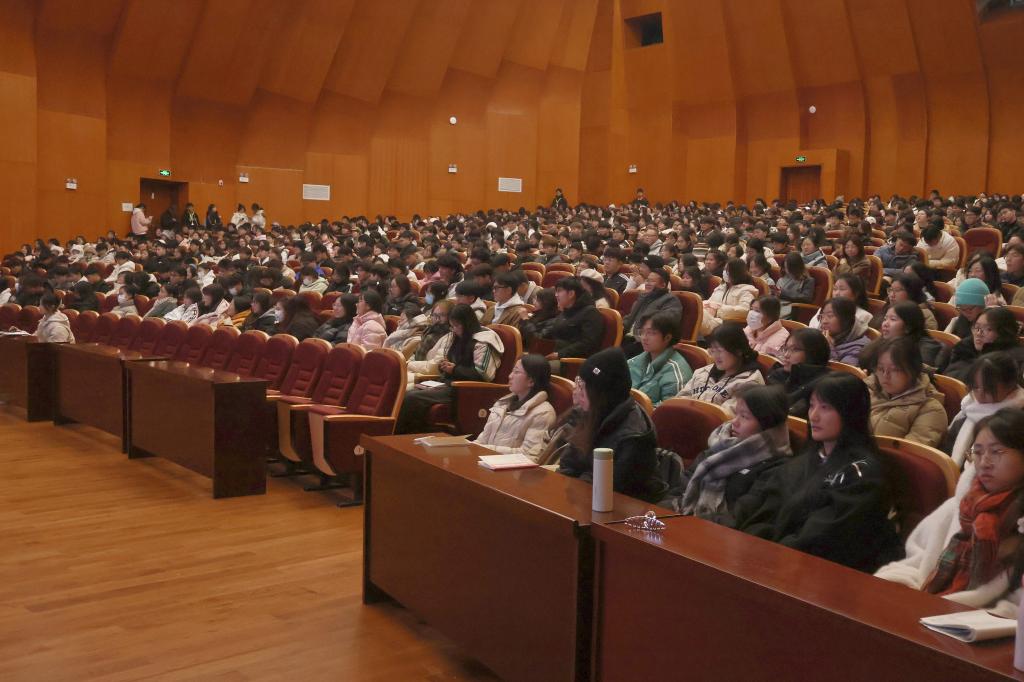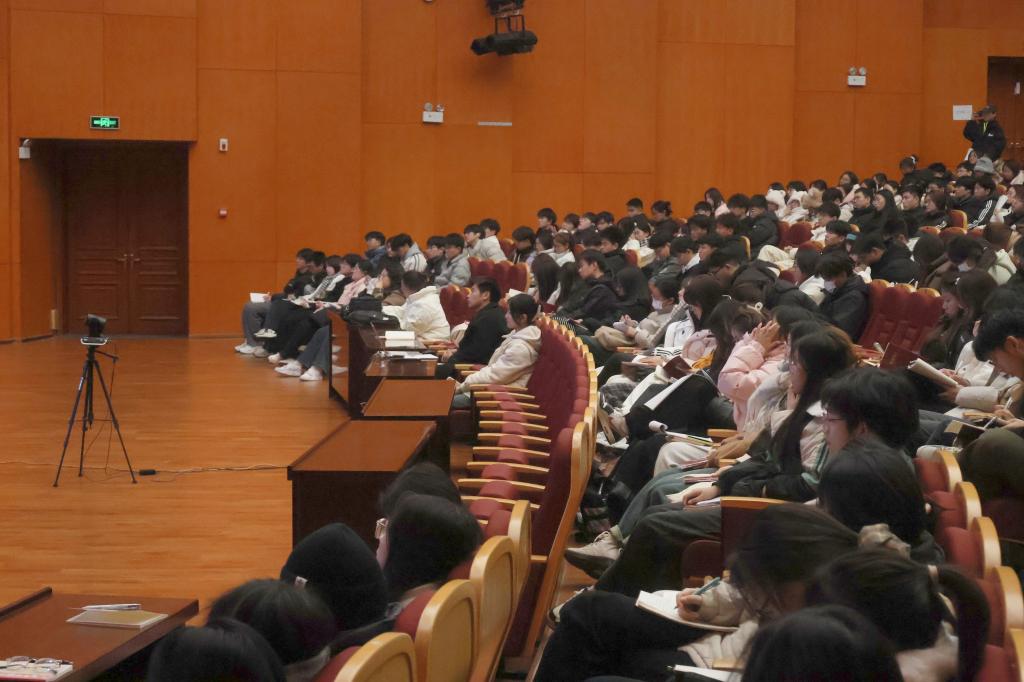 杜倩以《铸牢中华民族共同体意识,树牢马克思主义宗教观》为题,从“中华民族共同体的基本理念”“党的宗教工作理论和方针政策”与“案例和应对措施”三个方面为大家作详细讲解。她强调教育应与宗教相分离,全体学生应树立“崇尚科学,反对非法宗教”的观念,提升自身政治敏感性,具备识别和抵御宗教违法活动的能力,自觉抵制邪教侵蚀。