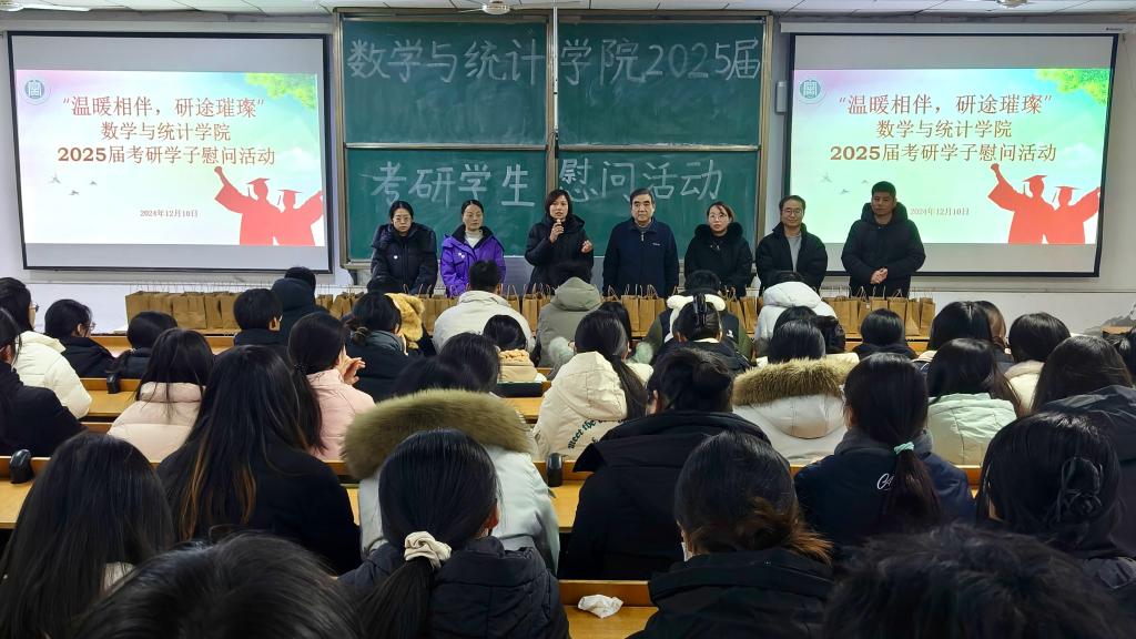 为帮助考研学子提振士气,缓解备考压力,12月10日下午,数学与统计学院在社科楼112教室举办“温暖相伴,研途璀璨”2025届考研学子慰问活动,数学与统计学院院长俞迎达、党总支书记高昌慧、学工干事田媛、全体辅导员参加了此次活动,本次活动由高昌慧主持。