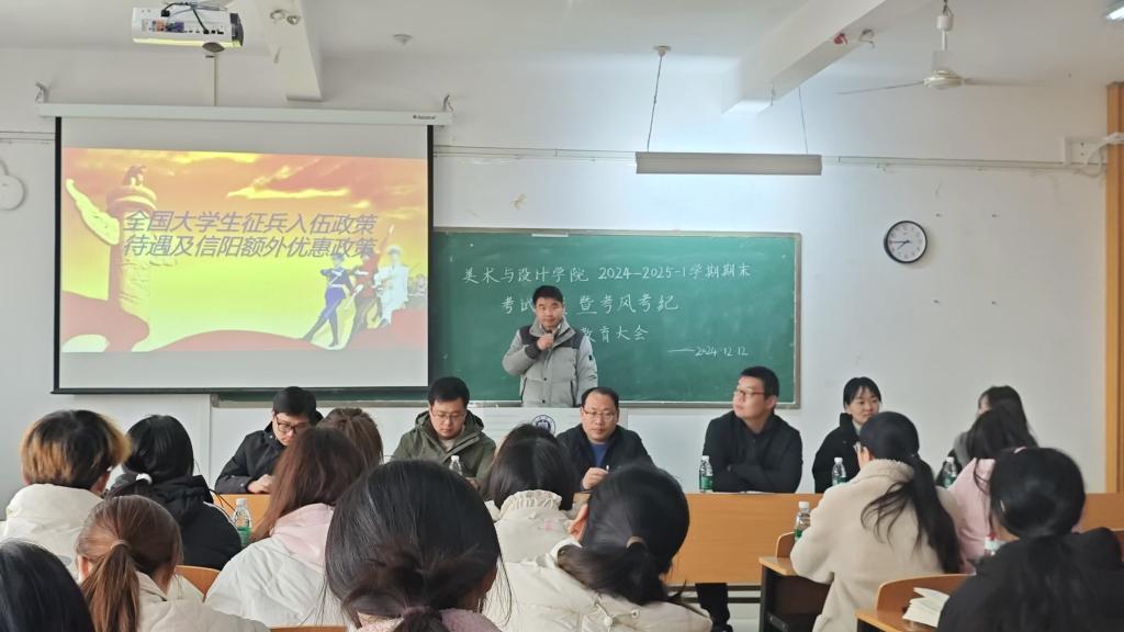 为推进我院2025年征兵工作,进一步激发大学生家国情怀,激励更多热血青年投身军旅、建功立业,12月12日中午,美术与设计学院在艺术楼407教室召开2025年征兵工作动员会暨启动仪式。学院党总支书记郑山峰、学工干事秦金峰、征兵工作负责人刘加宽、全体辅导员、有参军入伍意向的应届毕业生和各年级学生干部代表参加此次会议。