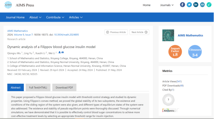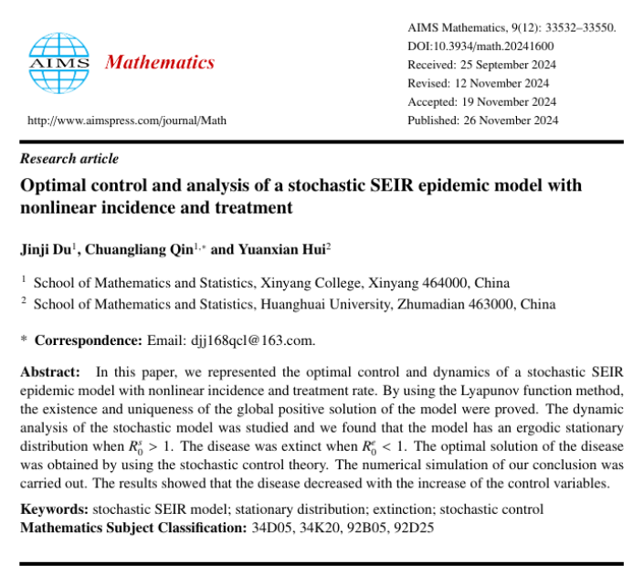 近日,数学与统计学院青年教师杜金姬(第一作者)和吴琼茹(第一作者)分别在国外核心期刊《AIMS Mathematics》(SCI3区)上发表题为“Optimal control and analysis of a stochastic SEIR epidemic model with nonlinear incidence and treatment”(一类具有非线性发生率和治疗的随机SEIR流行病模型的最优控制与分析)和“Dynamic analysis of a Filippov blood glucose insulin model”(一类Filippov血糖-胰岛素模型的动力学分析)的学术论文。