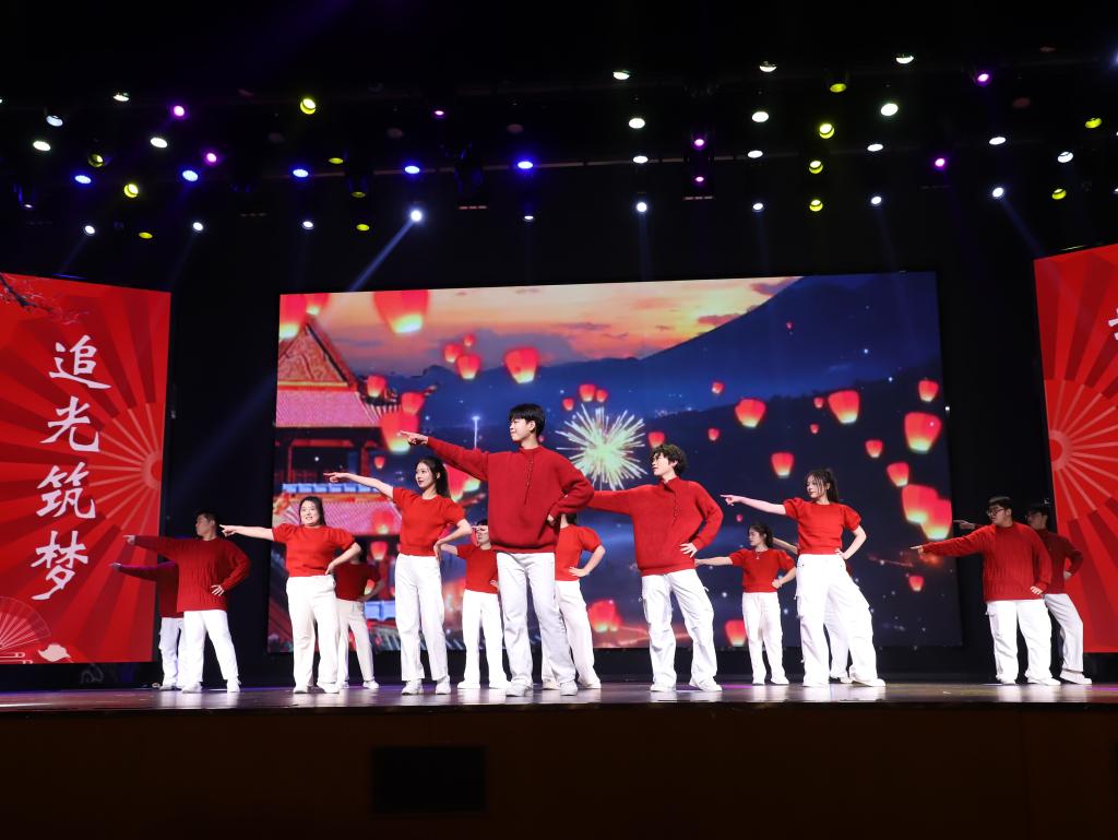 全体辅导员和学生干部表演的开场俏皮舞拉开了帷幕。集体舞蹈《新年快乐》喜庆欢快、活力四射。赵瑞乐、马晓睿两位同学合唱的《太阳》以其激昂的旋律和深情的演绎,赢得了全场的持久掌声。活力四射的现代舞和走秀表演点燃了现场气氛,展示了青春的激情与梦想。袁汝波教授的二胡独奏将经典曲目《赛马》《洗衣歌》表现得淋漓尽致。解开老师的萨克斯独奏用其悠扬的音色和精湛的技艺,诠释了《青鸟》的精彩。环境设计教研室教师表演的小合唱《这世界那么多人》用动听的歌声和深情的演绎,表达了对未来的美好憧憬和对新年的美好祝福。舞蹈《寄明月》和诗朗诵《月光下的中国》展现出对祖国美好的祝福。相声《大一生活二三事》、小品《诈骗联盟》和话剧《谁杀死了周日》用幽默而深刻的剧情讨论了校园生活和社会问题。最后,晚会在歌曲《明天会更好》中落下帷幕。