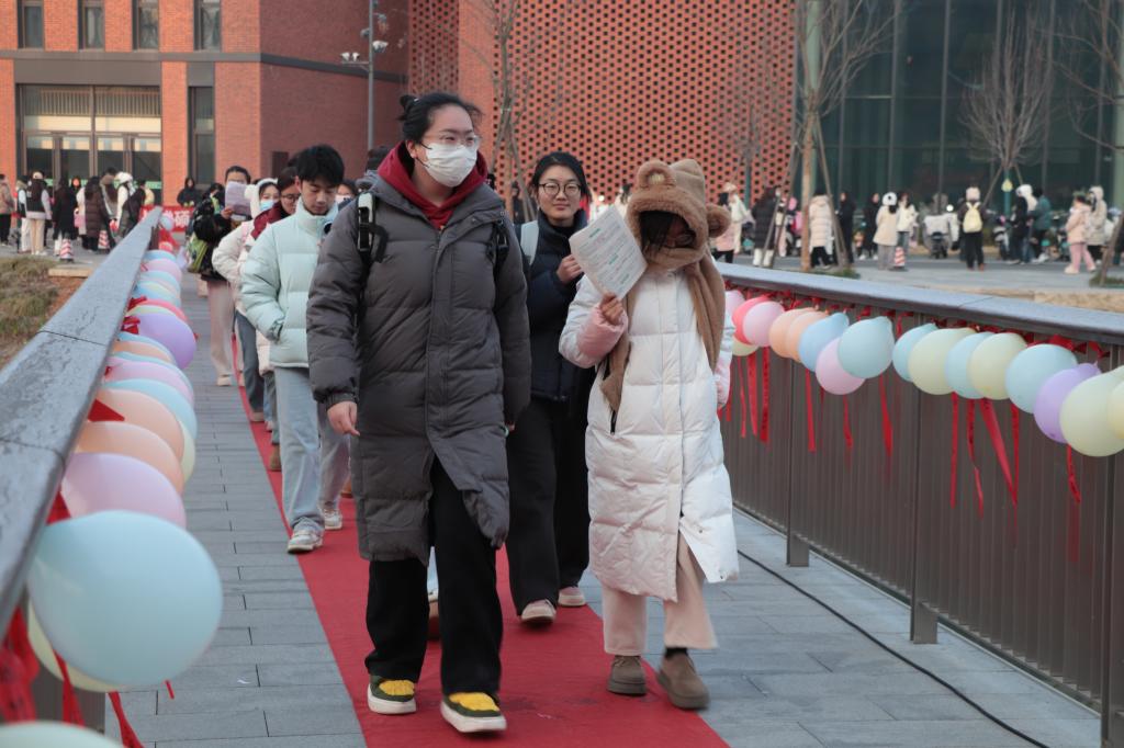 12月21日,2025年全国硕士研究生考试正式开始,早上7点,我院全体院领导、各考研班辅导员以最温馨的话语为考研学子送上了最真诚的祝福,请考研学生经过“上岸之桥”,走红毯、跨拱门、上台阶,鱼跃龙门,金榜题名。尽管寒风凛冽,但在由衷的祝福中,形成了温馨和谐的氛围,有效缓解了同学们的考前压力。