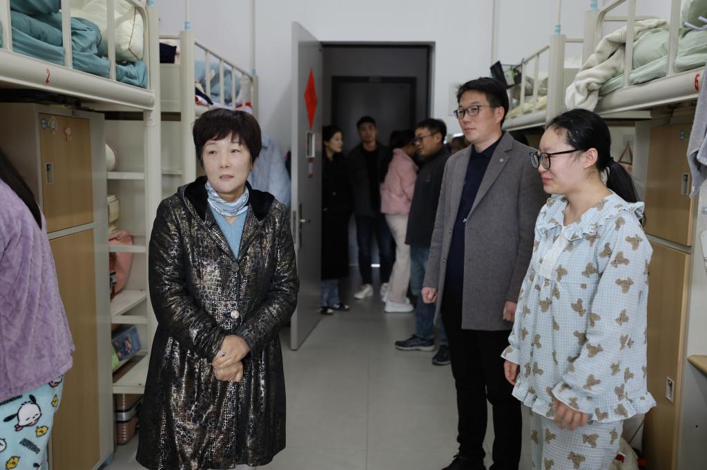 张凌江院长在党员宿舍走访过程中与学生亲切交谈,了解学生近期的学习、生活情况,并详细地询问了同学们对于教学以及校园工作的一些建议,她希望同学们能够认真对待下一阶段的学习和生活。同时,张院长也强调了宿舍卫生及用电安全等情况,确保学期期末各项工作平稳、有序地落实。