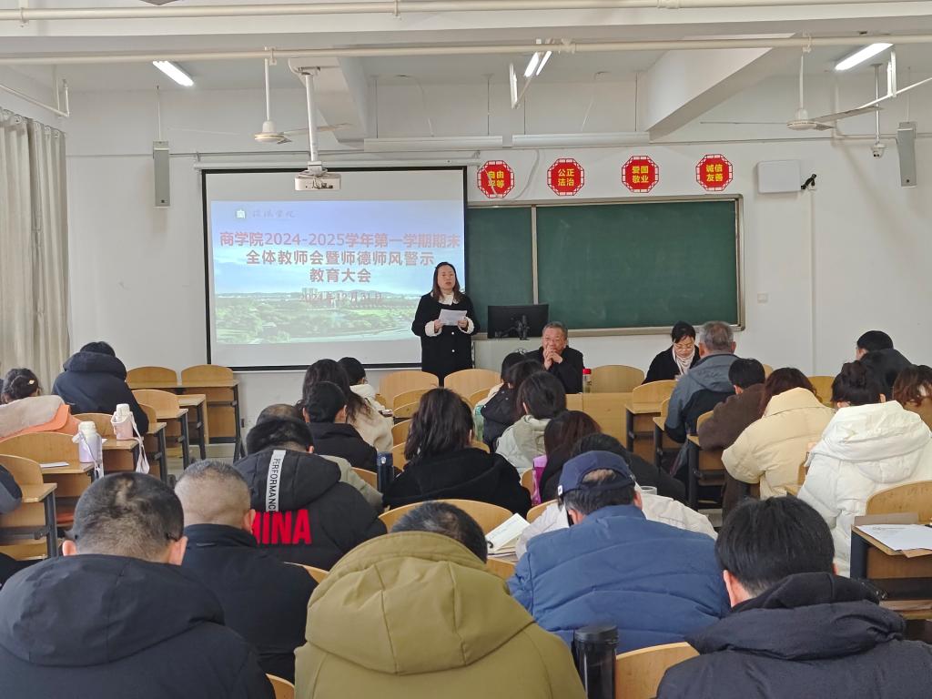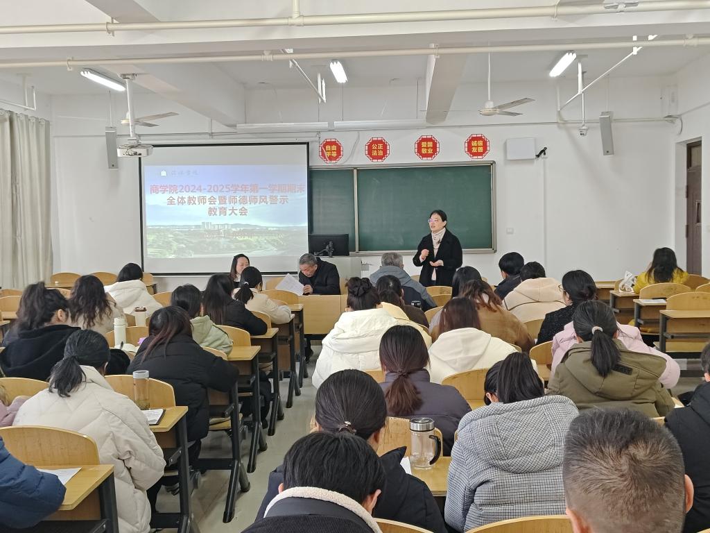 12月31日,商学院在综合楼608教室召开2024-2025学年第一学期期末全体教师会暨师德师风警示教育大会。商学院党总支书记胡秀云、副院长李毓、吴新静及全体教师参加了会议。会议由胡秀云主持。