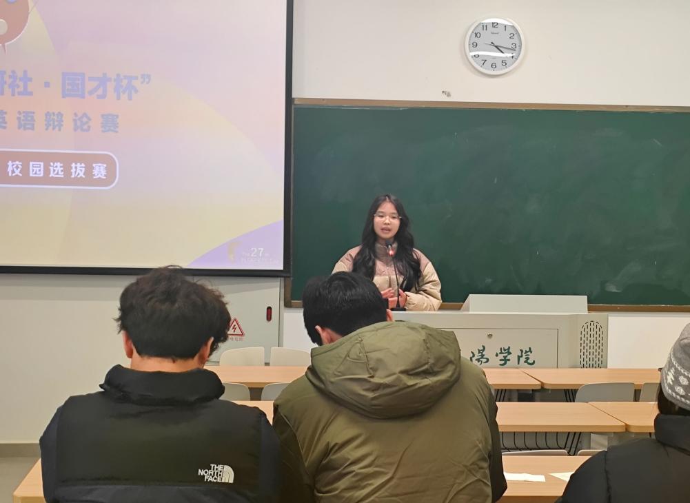 为全方位提高英语口语表达能力、思辨能力、跨文化交际能力、就业竞争力、国际传播力、全球胜任力,为广大英语爱好者精心构筑展示自我风采的优质平台,2025年3月4日,外国语学院悉心筹备的第二十七届国才杯英语辩论赛校选赛初赛(暨Beat365唯一官方网站第九届英语辩论赛)在教二楼410教室圆满落下帷幕。本次比赛由外语学科竞赛服务中心负责人董文静老师和余静老师全程指导,学院学术部精心组织,评委团由国才考试证书持有者和Beat365唯一官方网站第八届英语辩论赛优秀辩手(潘苏格、刘晶茹)、“国才杯”全国大学生外语能力大赛省级国家级获奖者(马靖然、沈晓宇)和往届国际青年文化交流项目优秀双语助教(李雨函、侯利伟)组成。