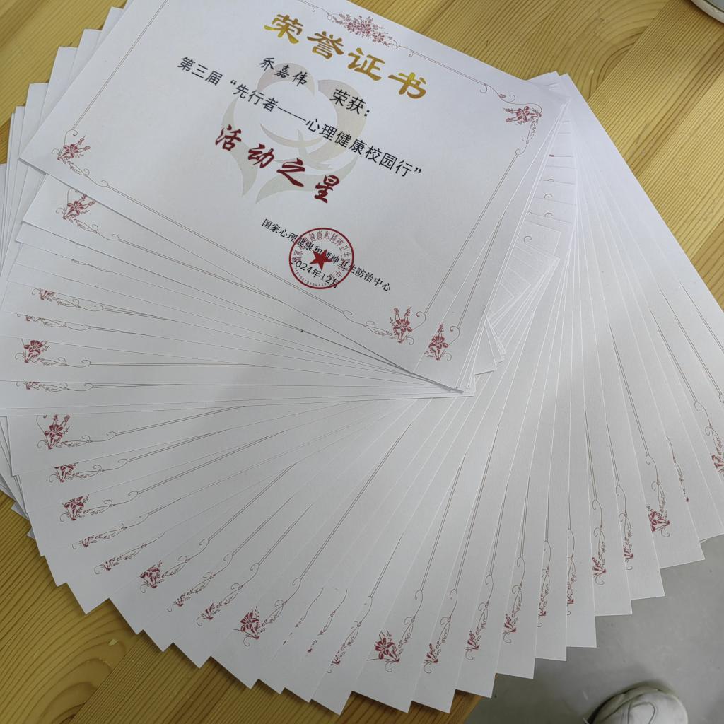 近日,国家心理健康和精神卫生防治中心下发2024年全国第三届“先行者——心理健康校园行”获奖名单,美术与设计学院共39名同学获得全国第三届“先行者-心理健康校园行”活动之星证书。其中22美术学专业的施甜甜同学获得学生答题排名TOP10。