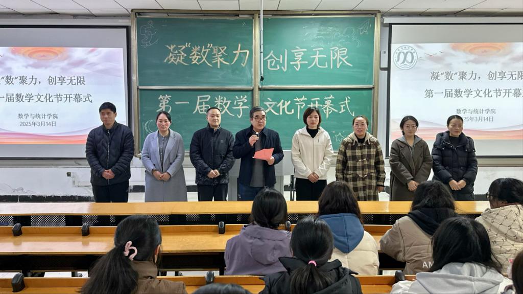 为纪念第六个国际数学日,传承数学文化精髓,激发学子对数学学习的热情与创新潜能,促进数学学科繁荣发展,数学与统计学院举办第一届数学文化节,活动主题定为“凝数聚力,创享无限”。开幕式于3月14日下午,在社科楼112教室举行。院长俞迎达、党总支书记高昌慧、副院长张聪、学工干事田媛、行政干事闫珍珠、全体辅导员和200余名学生代表参加了开幕式,开幕式由高昌慧主持。