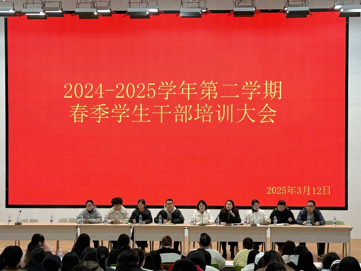 3月14日中午,外国语学院在南湖校区教二楼117报告厅召开2024-2025学年春季学生干部培训大会。学工干事何珊珊、全体辅导员、第十八届团总支学生会全体成员及各年级班委代表参加会议。会议由郑青主持。