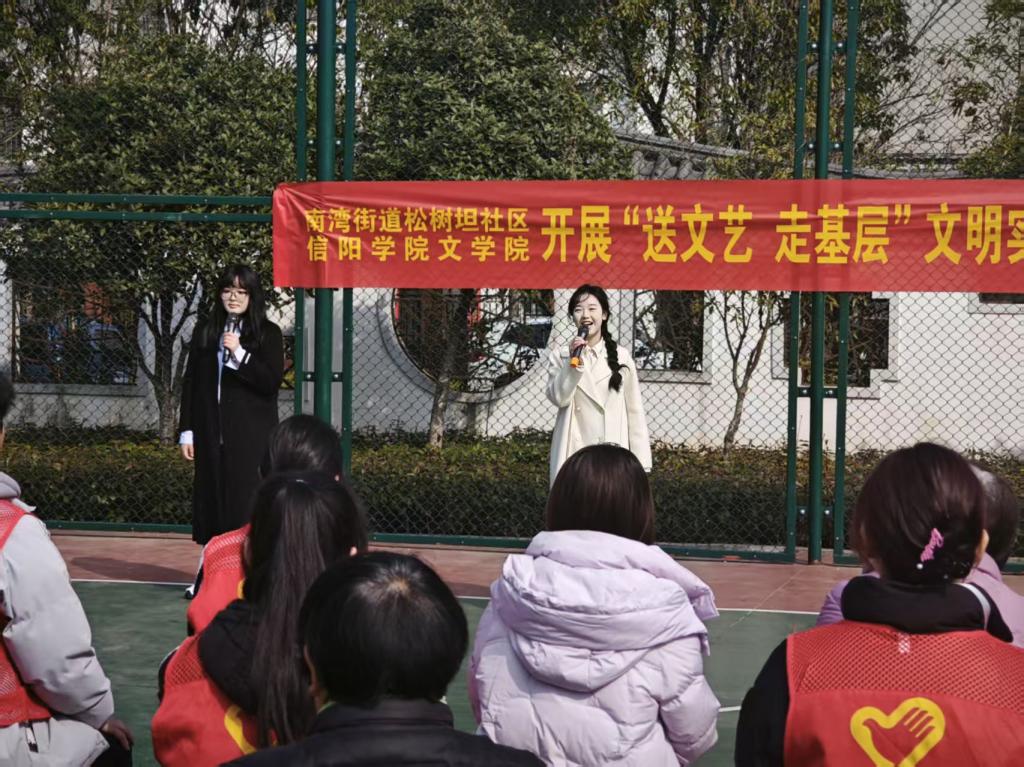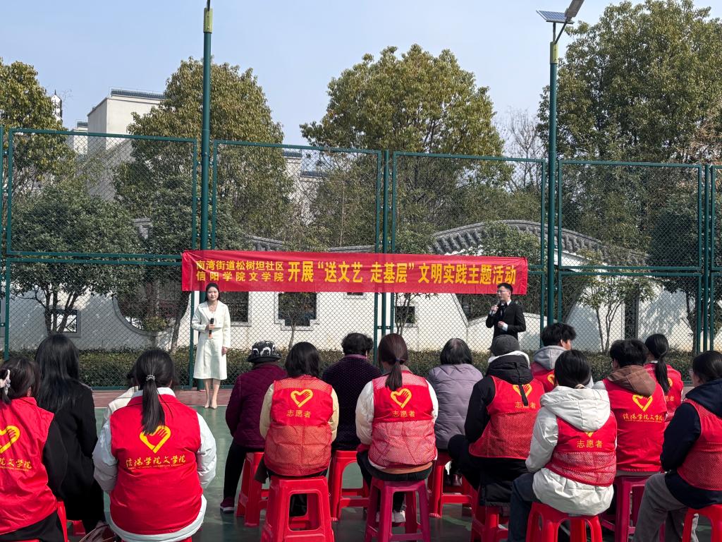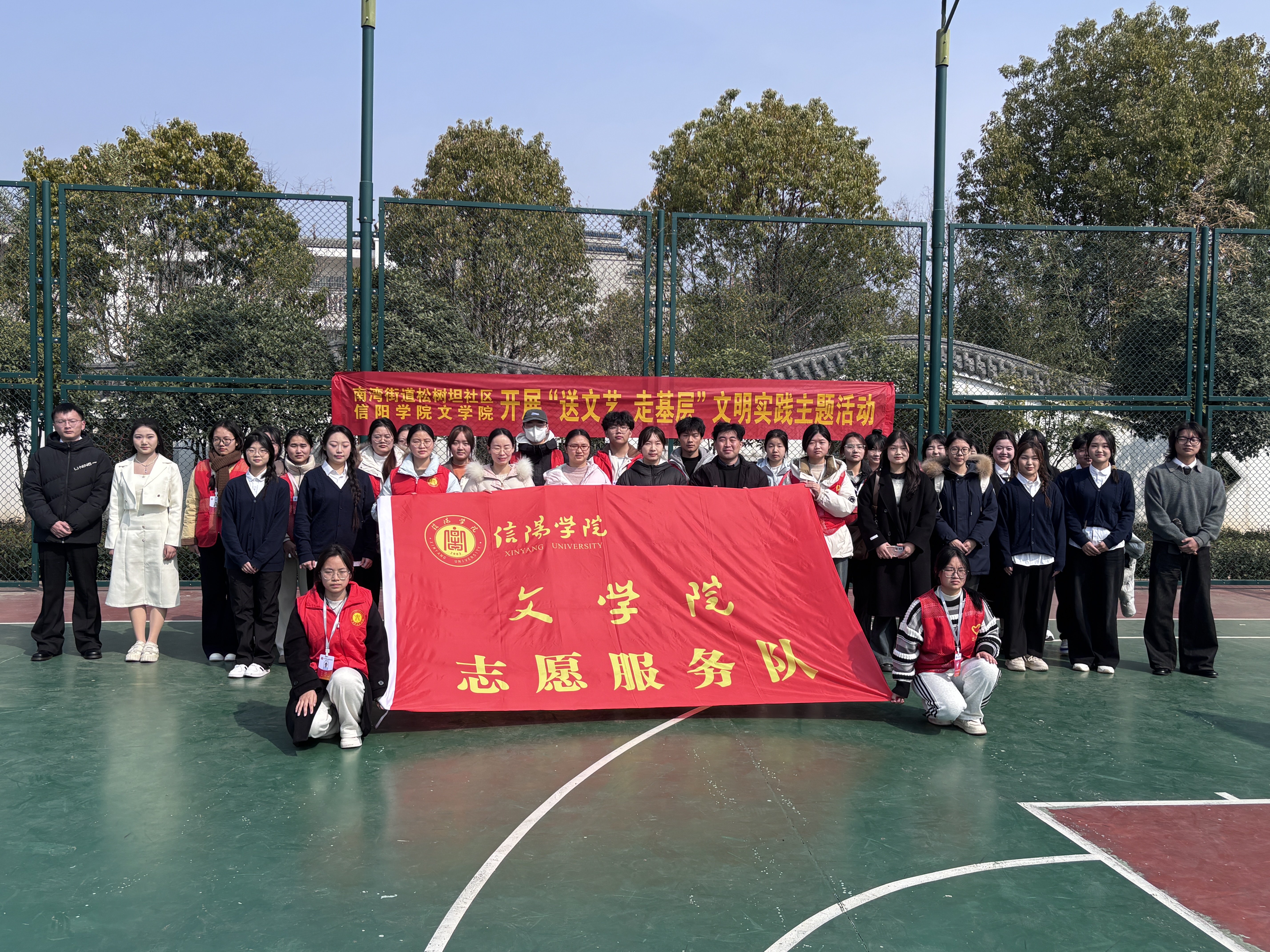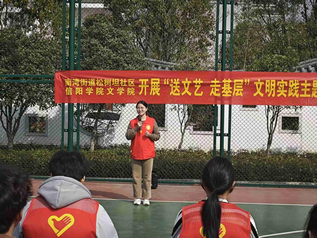 为了纪念伟大的共产主义战士雷锋同志,落实党中央领导关于学习和传承雷锋精神的通知,进一步传承和践行雷锋精神,Beat365团总支书记段艳婷老师与刘娟、赵晓伟、孙嘉璐等老师带领文学院志愿服务队成员,及文学院学生会文艺部成员于2025年3月7日,在信阳市浉河区松树坦社区举办了“三月春风暖,社区雷锋行”主题志愿服务活动。