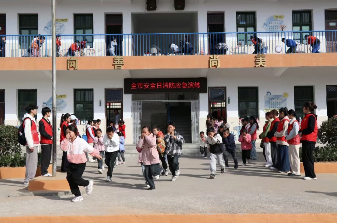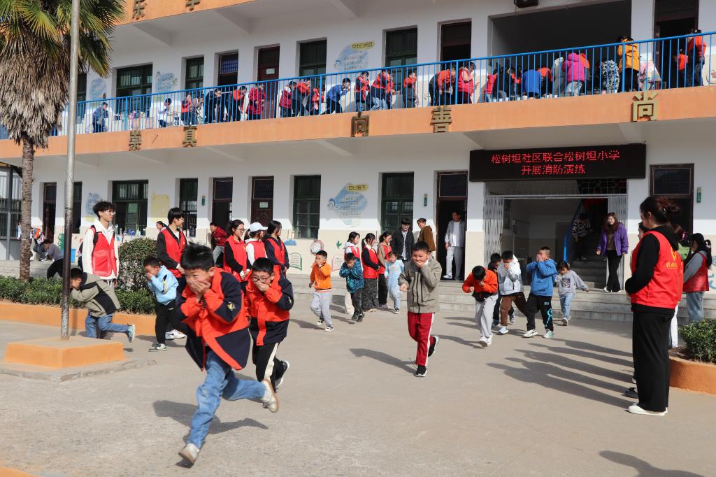 活动伊始,火灾警报响起,学生们迅速做出反应,在文学院老师、志愿者及松树坦小学任课老师们有条不紊地协同疏导、指引下,学生们弯腰、低头、捂鼻,秩序井然地从教室撤离到操场前的空地。在不到一分钟的时间里,学校全体师生成功撤离教学楼,在操场前全数集结完毕。