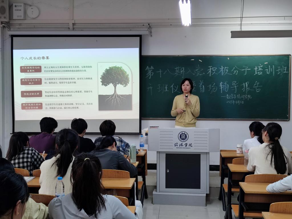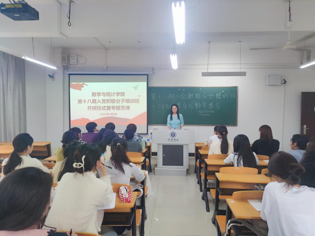 为进一步加强入党积极分子的培养教育,提高思想觉悟和政治素养,4月8日下午,数学与统计学院在社科楼501教室举行第十八期入党积极分子培训班开班仪式暨专题党课。学院党总支书记高昌慧、各学生党支部书记以及第十八期全体入党积极分子参加学习活动,仪式由组织员范学琴主持。