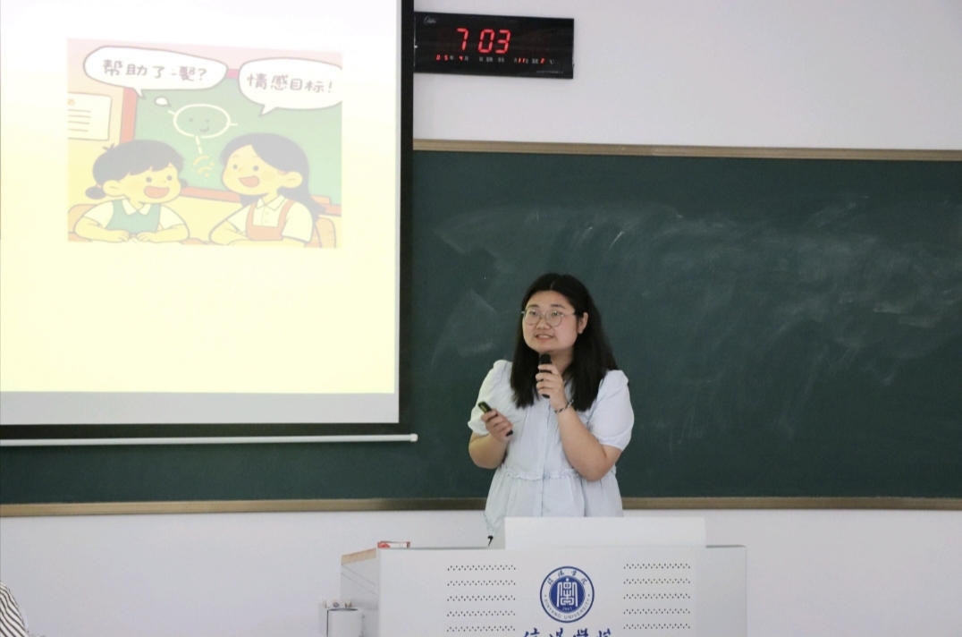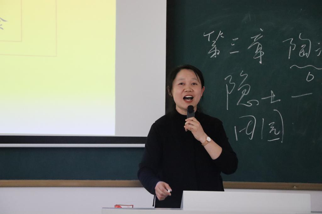 陈苗苗老师选取《现代汉语(一)》中《词义及其性质和构成》作为本次比赛的主讲内容,陈老师借助典型词语将书本上晦涩难懂的知识点用通俗易懂的方式呈现在评委老师面前,流利清晰的讲解,生动形象的教学模式获得了在座老师们的称赞;徐一丹主讲《中国古典文献学》,结合学科特点与教学内容,以《四库图书》为例配合图文并茂的课件,让在座老师对《四库全书》这一古典文献有了更加深刻的认识。面对评委老师的提问,徐一丹老师提到并展示了日常教学中与同学们一起制作的文献书籍作品,以此来提高同学们对这一学科的兴趣,从而更好地掌握书本上的知识。