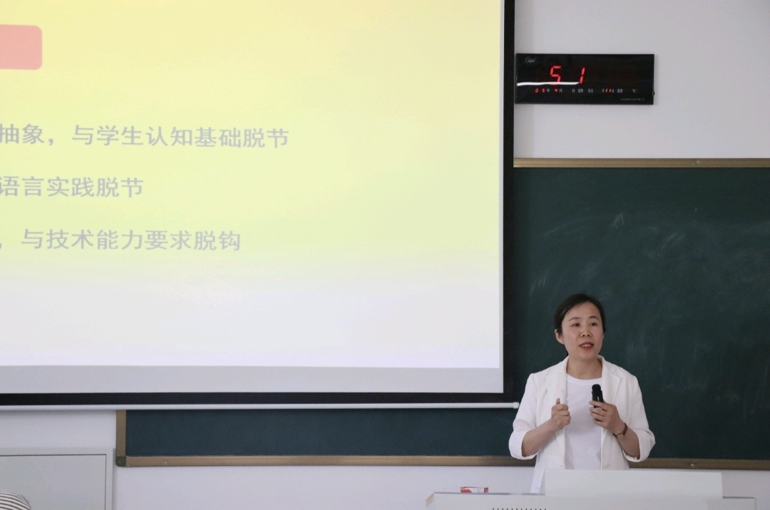 对于这次十二位参赛教师的课堂展示,贾学清教授从课件制作、说课内容与时间的把握以及授课中的注意事项三个方面对老师们作出指导。贾教授重点对授课过程中老师们需要注意的问题提出了详细的建议。他指出,作为参赛教师,应注意授课内容上的完整性与课堂氛围的营造,将充满激情的积极一面展示在学生面前。同时,他强调老师们要有美观的板书设计,语言简明扼要,铿锵有力。贾教授的精彩点评获得了在座老师的肯定和热烈掌声。