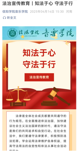 为认真落实教育系统“八五”普法规划,进一步加强青年学生法治教育,营造学法、知法和普法氛围,近日,音乐学院组织开展了2025年“法治宣传周”系列活动。
