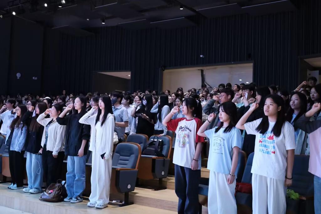 知识分享环节结束后,各班级班长、团支书依次领取反诈宣传海报,这些海报将张贴于宿舍公共区域,成为日常警示教育的“流动课堂”。在领誓人的带领下,全体师生右手握拳庄严宣誓:“擦亮双眼识骗局,筑牢防线护平安!”铿锵誓言回荡全场。辅导员老师结合真实案例强调:“反诈不仅是口号,更要内化为习惯,希望同学们争做校园安全卫士。”
