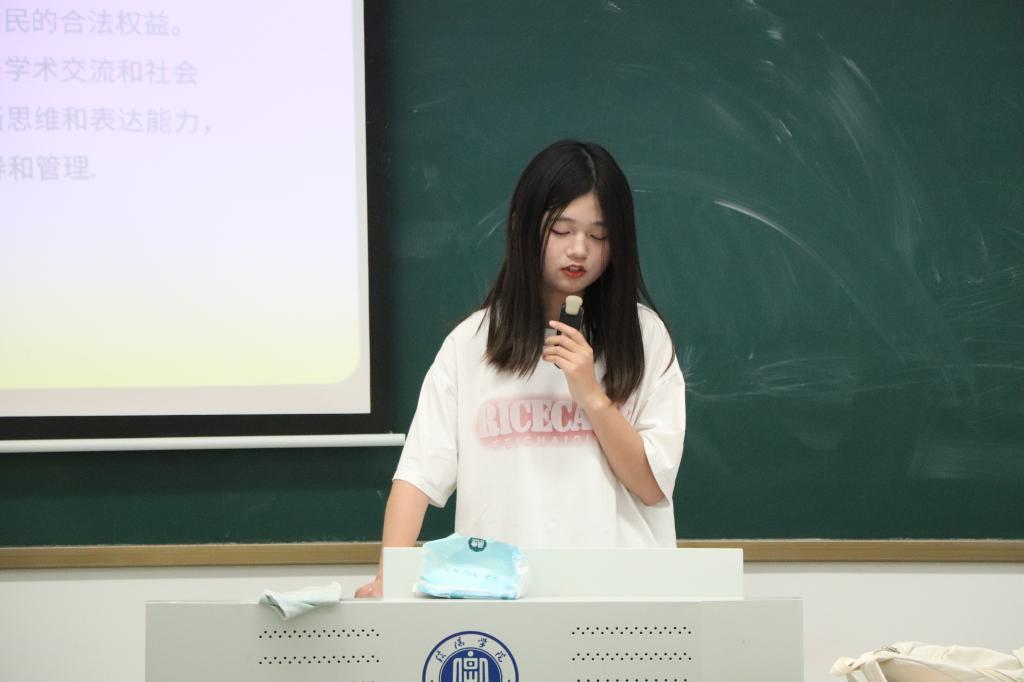 活动伊始,李梦璠从法治信仰的含义、法治历程、法治建设的挑战和大学生的做法几方面进行演讲。强调了法治建设的不易以及大学生的做法,利于大学生深入了解宪法知识,提升自身的法治素养。