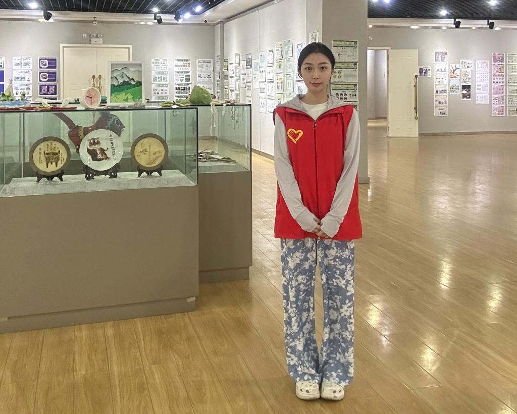 在信阳市美术馆,“第五届文化创意设计大赛”主题展览吸引众多游客驻足。美术与设计学院学生志愿者张子妍化身讲解员,结合自身专业背景,为观众解读艺术作品的设计理念与创作故事。他们通过梳理信阳毛尖的历史脉络、茶器工艺的演变历程,将静态展品与动态文化传播相结合,让游客沉浸式感受茶韵与艺术交融的魅力。