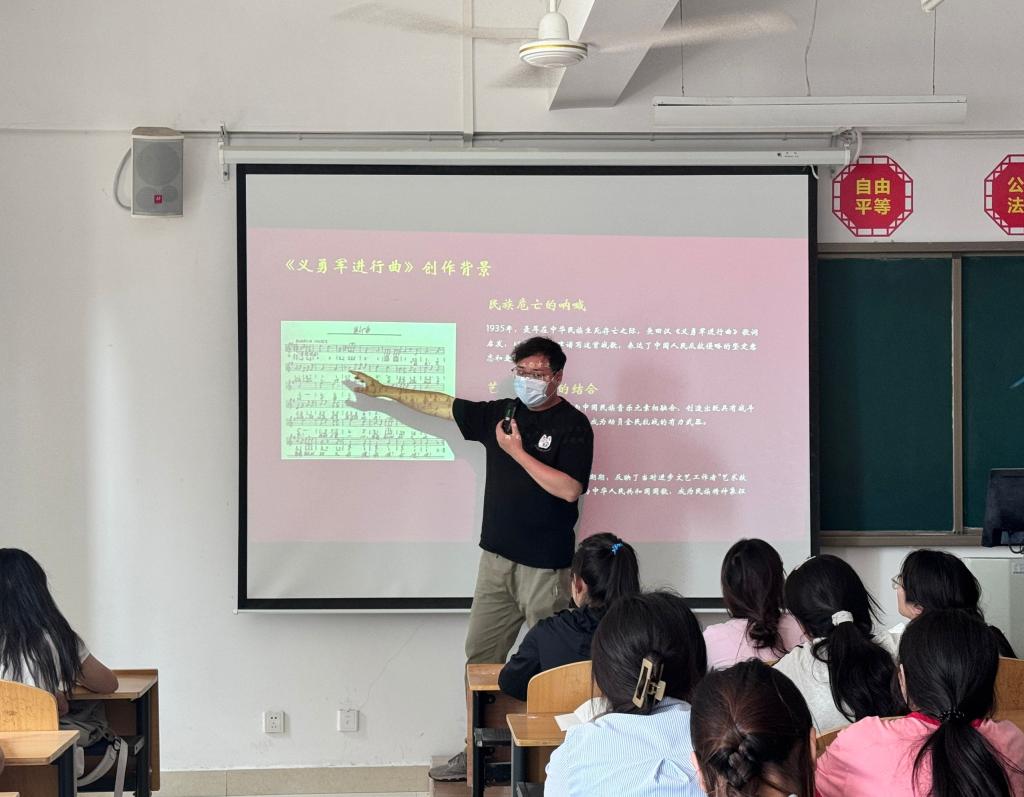 随后,刘一辰详细介绍了聂耳的生平。从怀揣音乐梦想的懵懂少年,到在时代浪潮中逐渐成长为以笔为枪、以乐为刃的人民音乐家,聂耳的成长历程令人动容。最后,刘一辰深入讲述了《义勇军进行曲》从作为电影《风云儿女》主题曲诞生,到正式更名并确定为中华人民共和国国歌的历程。这短短四十六秒的旋律,凝聚着民族力量,成为中国最强音。聂耳的故事也激励着同学们将个人成长与国家和时代发展紧密相连。