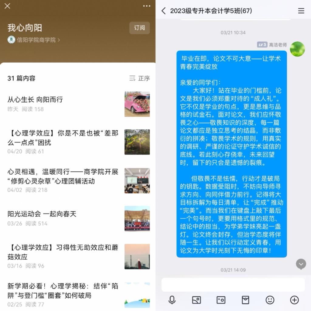 商学院充分利用课前十分钟、QQ群和微信公众号推文等形式,多渠道开展心理健康知识的普及与宣传工作。尤其是商学院微信公众号专门开辟的“我心向阳”板块,每月定期发布推文,以生动有趣、通俗易懂的方式宣传、普及心理健康知识,让心理健康知识深入人心,走进同学们的日常生活。