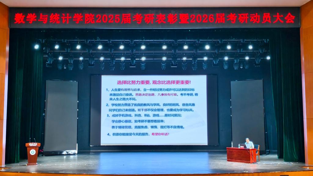 6月4日,数学与统计学院在音乐厅隆重召开2025届考研表彰暨2026届考研动员大会。学院领导班子、考研导师、全体辅导员、2025届考研成功学生、2026届全体学生及2027届考研意向学生代表参会。会议由党总支书记高昌慧主持。