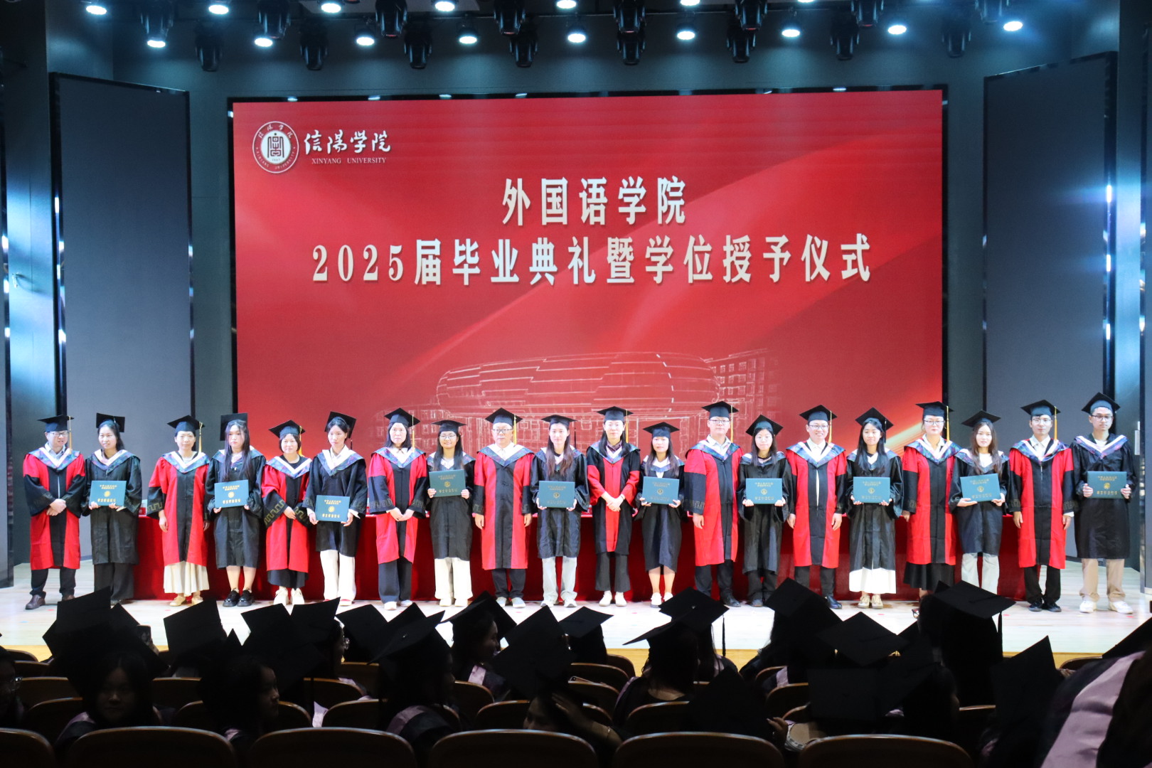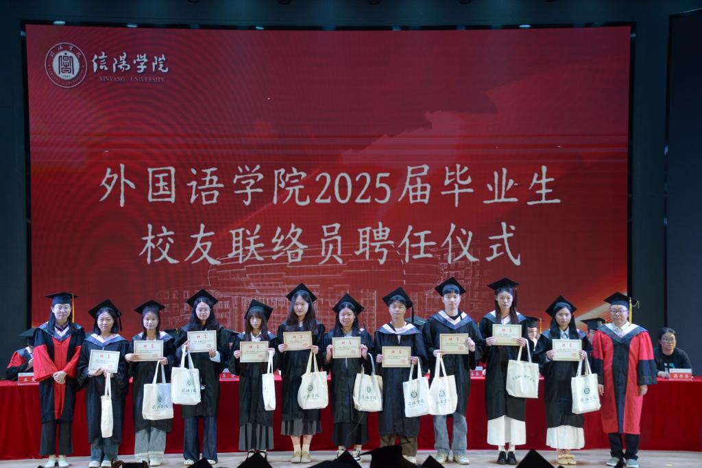 毕业典礼在雄壮的国歌声中拉开序幕。学院领导以及专家教授代表共同为2025届毕业生正冠拨苏,并合影留念。随后举行聘任校友联络员仪式,外国语学院院长罗德喜、党总支副书记程娇炎为同学们颁发聘书及纪念礼品。
