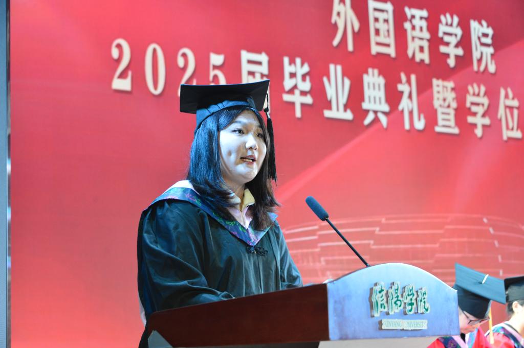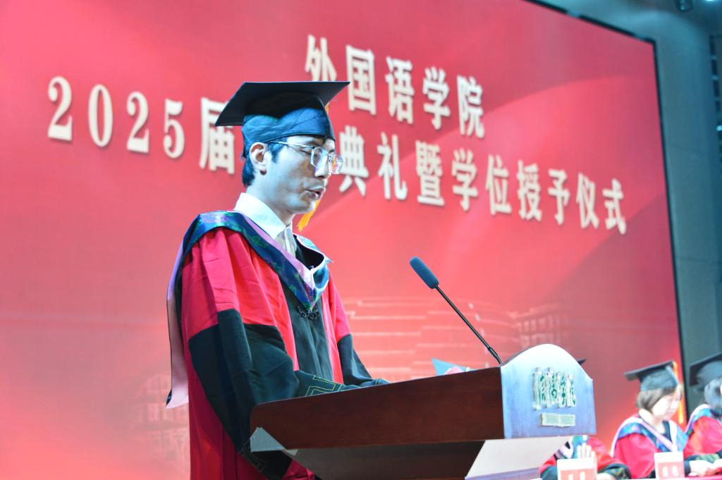 青年教师易威伟作为优秀教师代表发言。他讲到,2025届毕业生从入学时的青涩,历经学科竞赛、毕业论文等挑战,成长为专业扎实、独立自信的成熟人才。希望学院精神在严谨治学、无私育人的师生间代代相传,前辈引领后辈,温暖同行。寄语毕业生带着对语言的热爱、跨文化沟通能力、批判性思维和坚韧精神,无论深造或就业,都能以语言为帆、梦想为舵,勇敢驶向未来。