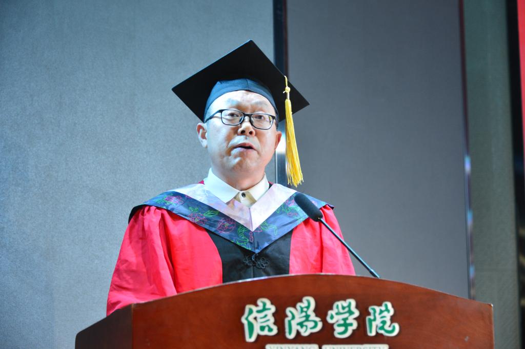 随后,外国语学院院长罗德喜发表毕业寄语。罗院长高度赞扬了本届毕业生展现出的拼搏精神与青春活力,向毕业生表示祝贺与自豪。致辞强调,大学毕业标志着成熟与独立,人生的价值在于创造有价值的人生。在人工智能时代,寄语毕业生发挥外语专业优势与跨文化能力,将人文精神融入技术浪潮,“学好外国语,做好中国人”。希望学子们牢记“内外兼修,学贯中西”的院训,将个人价值与国家发展紧密结合,在实干中成就梦想,在时代洪流中乘风破浪。典礼最后,学院深情祝福毕业生事业有成、生活幸福,并嘱托他们常回“家”看看。现场以深情的“Farewell, my students! Farewell, my kids!”作别。