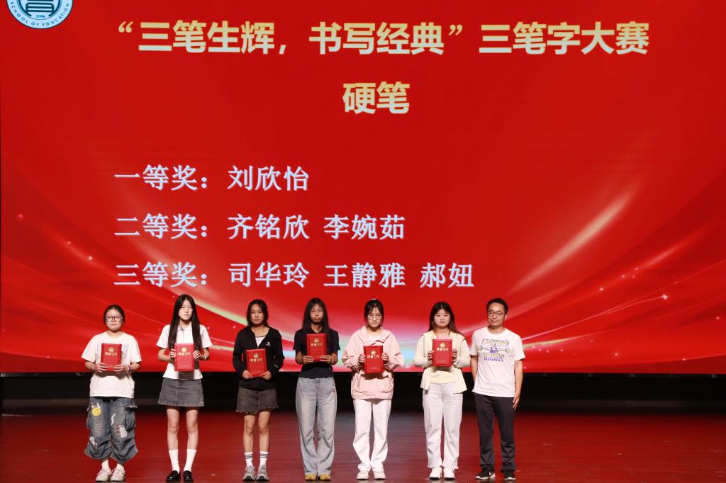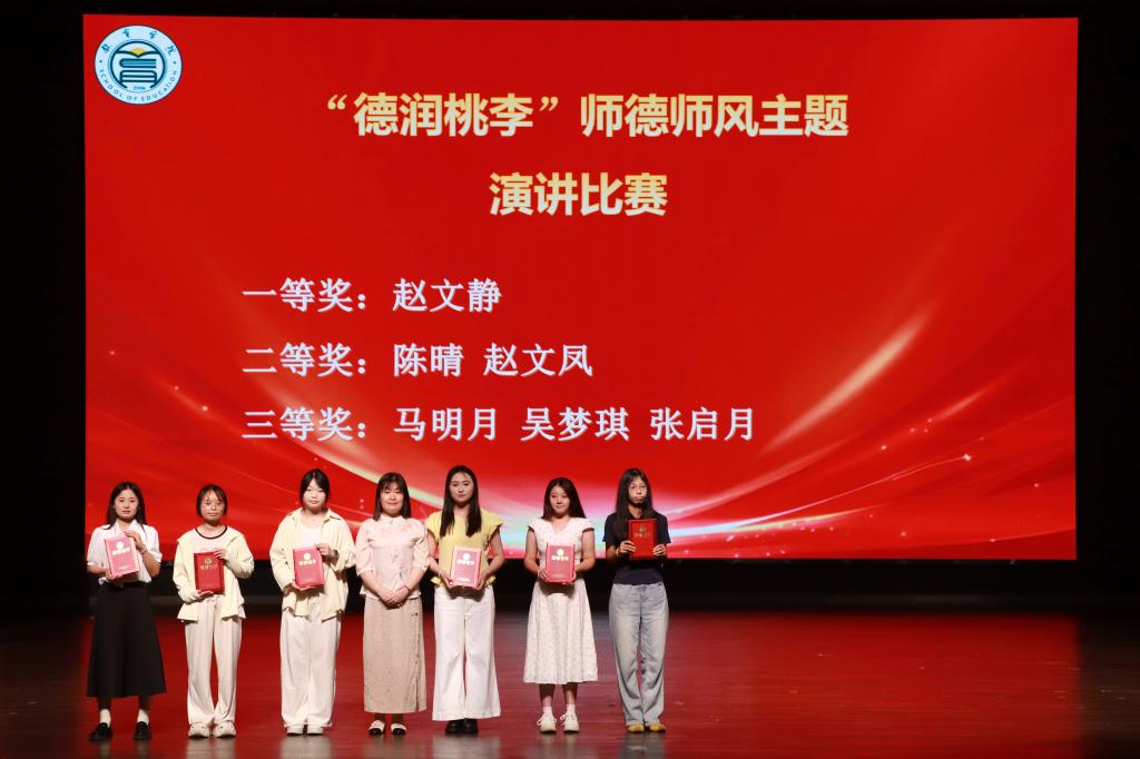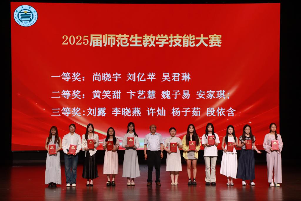 中场演出同样亮点频现。原创舞蹈《水龙吟》尽显古典韵味;河南省师范类专业毕业生技能比赛一等奖示范课《不完美也能美》引发对美的思考。中场节目结束后,第二场颁奖典礼接踵而至。名誉院长、党总支书记刘颖方、副院长段海丹、特聘教授赵国权分别为教师技能、歌曲、舞蹈以及师德演讲大赛的获奖者尚晓宇、刘亿苹、吴君琳等三十人颁发荣誉证书,并一同合影留念。