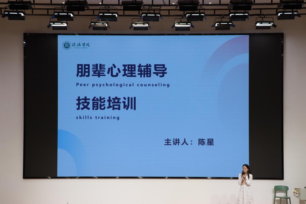 陈星老师以“朋辈心理辅导的原则与技巧”为主题展开培训,从“什么是朋辈心理辅导”“朋辈支持需要做什么”“如何有效开展辅导”三个维度进行系统讲解。陈星老师指出,学生遇到心理困扰时,仅有少部分学生会寻求专业帮助,大多数更倾向与朋友倾诉,并通过展示相关调研数据强调了朋辈心理辅导的重要性。