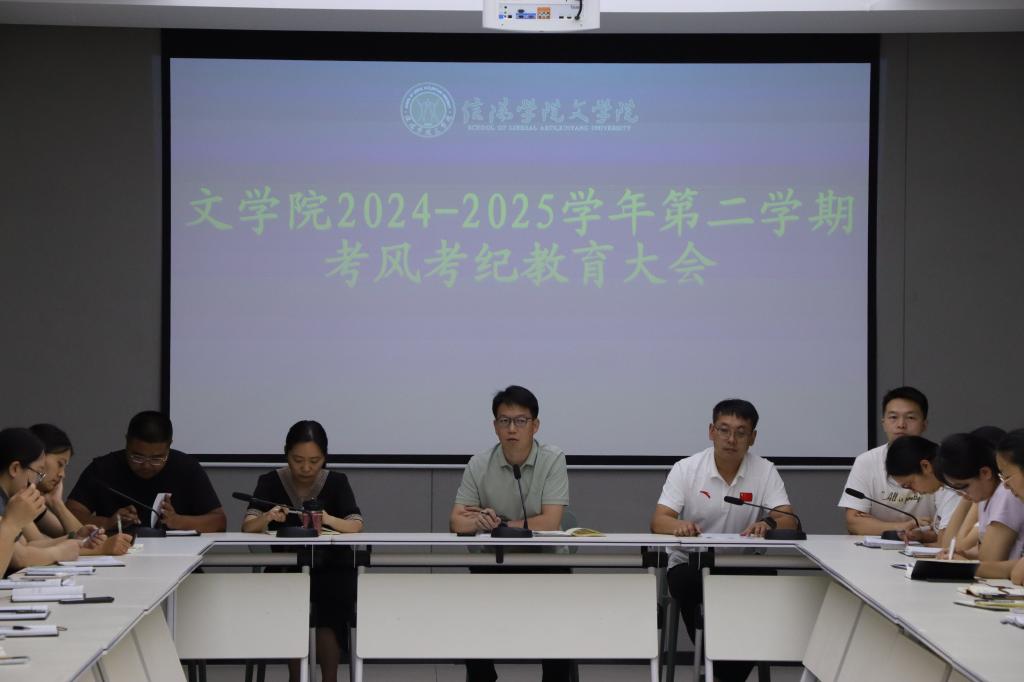 为进一步严肃考风考纪,强化学生诚信意识,营造公平公正的考试环境。6月12日上午,文学院于教一楼406会议室召开2024—2025学年第二学期考风考纪教育大会。出席此次会议的有党总支书记李赟、教学副院长黄亚妮、教学秘书陈浩、行政秘书陈俊、学工干事何军华以及文学院全体辅导员,各班学习委员参加了此次会议。会议由学工干事何军华主持。