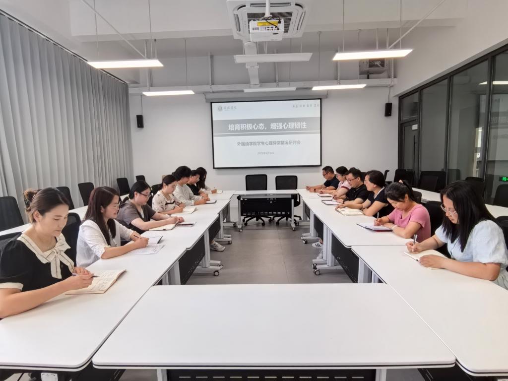 为筑牢学生心理健康防线,6月17日下午,外国语学院在教二316会议室召开大学生心理健康情况研判会。学院党总支副书记程娇炎、学工干事何珊珊、学生心理辅导中心教师张羽及全体辅导员参会。会议由二级心理辅导站站长沈蔷薇主持。